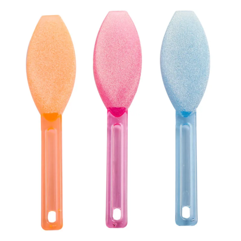 Cuenta con un mango plástico y una estructura granulada en curva, deal para desgastar durezas de la zona del talón.