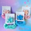 Contiene 2 gomitas scrunchie y un broche pequeño para cabello.
